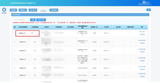 在企業(yè)業(yè)績頁面中查看企業(yè)工程業(yè)績信息。目前業(yè)績數(shù)據(jù)來自江蘇省建筑市場監(jiān)管與誠信信息一體化平臺,無需企業(yè)手動(dòng)進(jìn)行維護(hù)。其中“對應(yīng)工程類別要求”或“工程類別等級”若無數(shù)據(jù),需按照真實(shí)情況手動(dòng)進(jìn)行維護(hù)