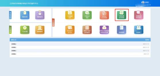 點(diǎn)擊首頁“企業(yè)管理”模塊中“工程監(jiān)理企業(yè)資質(zhì)”圖標(biāo)可進(jìn)入工程監(jiān)理企業(yè)資質(zhì)功能模塊頁進(jìn)行相關(guān)業(yè)務(wù)維護(hù)和辦理。