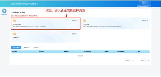 企業(yè)需要先進(jìn)行企業(yè)信息維護(hù),才可進(jìn)行資質(zhì)申請。點(diǎn)擊工程監(jiān)理企業(yè)資質(zhì)功能模塊頁中“企業(yè)信息維護(hù)”進(jìn)入企業(yè)信息維護(hù)頁面。