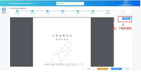 “申請表預(yù)覽”頁面展示系統(tǒng)根據(jù)企業(yè)填報(bào)的內(nèi)容自動(dòng)生成的申請表,點(diǎn)擊“下載申請表”按鈕下載申請表Pdf文件,企業(yè)將申請表打印后進(jìn)行蓋章,然后點(diǎn)擊“下一步”按鈕上傳蓋章掃描件。
