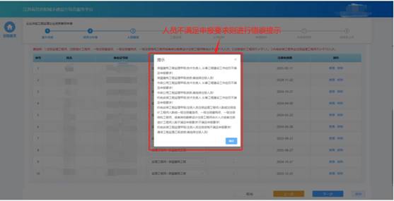 申請資質(zhì)的資質(zhì)標(biāo)準(zhǔn)對選擇的人員類型、數(shù)量進(jìn)行初步校驗(yàn),對于不滿足要求的人員進(jìn)行錯(cuò)誤提示。若選擇人員滿足要求則進(jìn)入下一個(gè)環(huán)節(jié)。