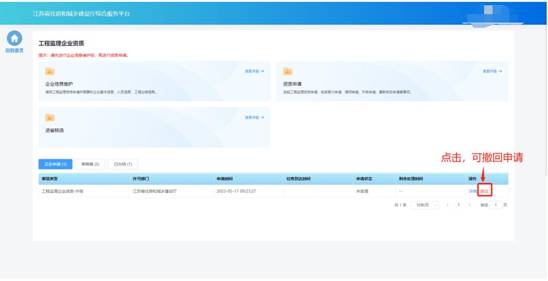 “正在申請”板塊中展示企業(yè)端已經(jīng)提交的、目前處于審核流程中的事項(xiàng)申請。在管理端受理之前,企業(yè)端可點(diǎn)擊操作列中的“撤回”按鈕撤回事項(xiàng)申請。