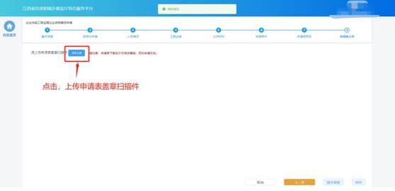 在“申請表上傳”頁面點(diǎn)擊“點(diǎn)擊上傳”按鈕,可上傳申請表蓋章掃描件,上傳成功后,頁面下方會(huì)展示蓋章掃描件內(nèi)容。確認(rèn)無誤后,點(diǎn)擊