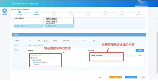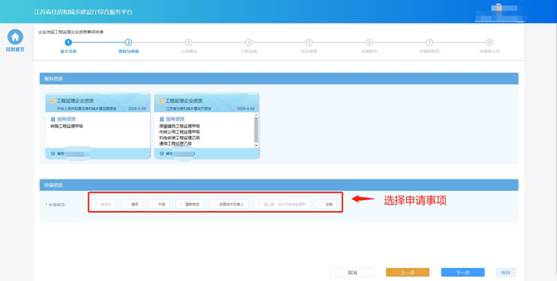 在“資質(zhì)與申請”環(huán)節(jié)頁面,企業(yè)選擇申請事項(xiàng)以及申請資質(zhì)。